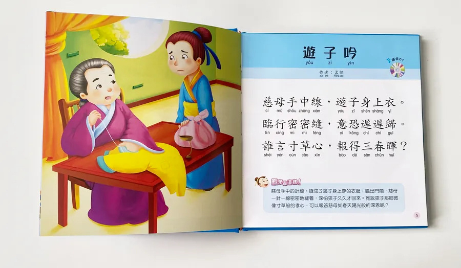 唸唐詩 (附CD)漢語拼音、白話解說 聽着優美的曲調,跟着活潑的節奏,讓孩子大聲唸出寓意深遠的唐詩。 精選42首唐詩,搭配輕快的曲調,以唸唱的方式學習,孩子很快就記住,並在過程中提升語文能力。生動的情境插圖,增加閱讀趣味,淺顯易懂的詩意說明,幫助孩子理解詩中寓意,提升對中華文化之認識及欣賞能力。 孩子反覆吟誦,提高朗誦能力,增加文化素養,唸出好文學,唸出好素養! 適讀年齡:5〜7歲 漢語拼音版,附CD 1隻
