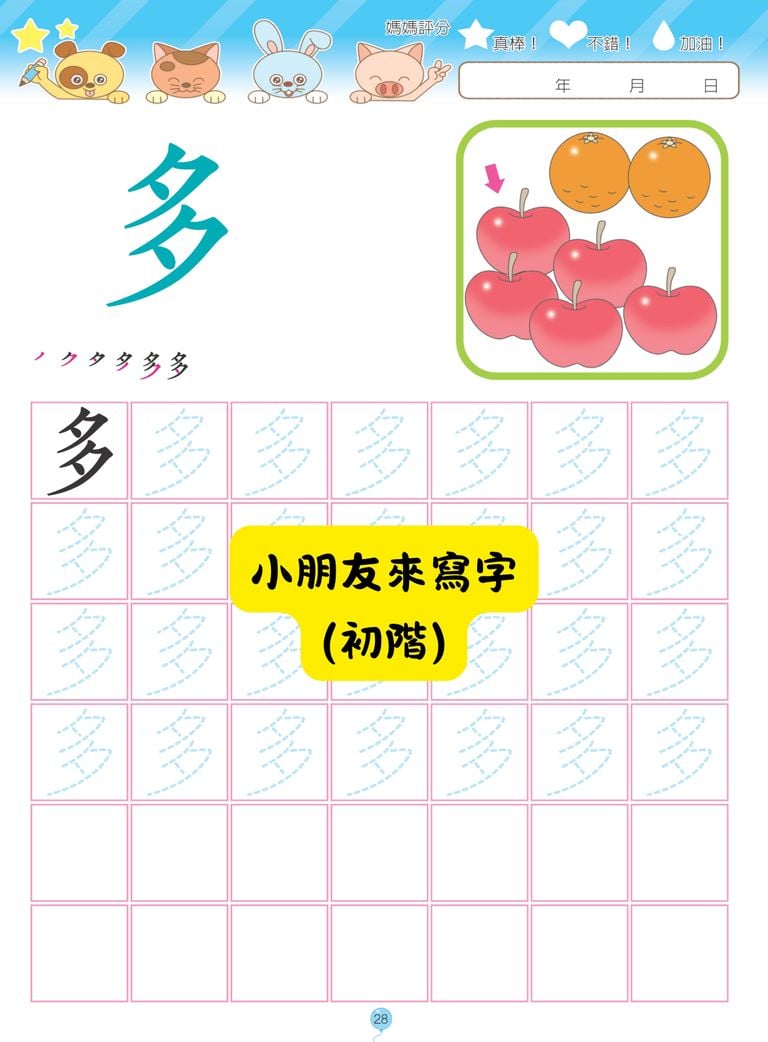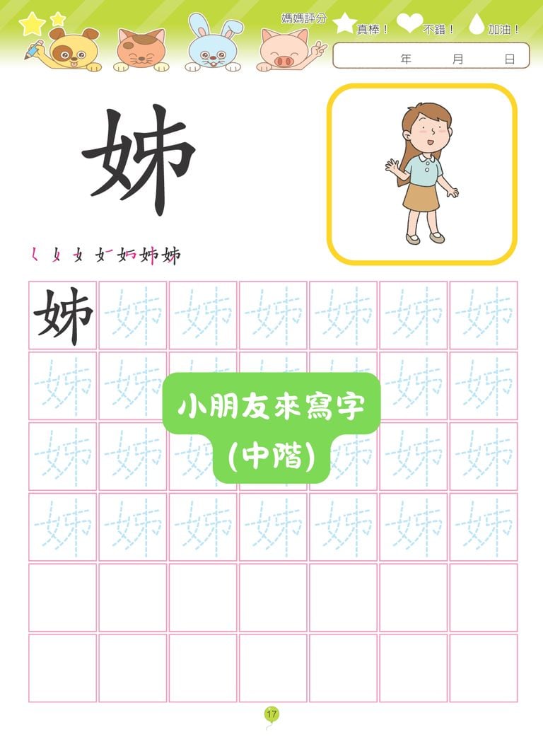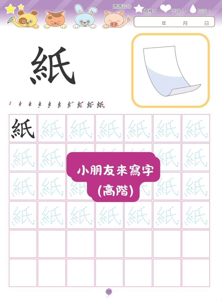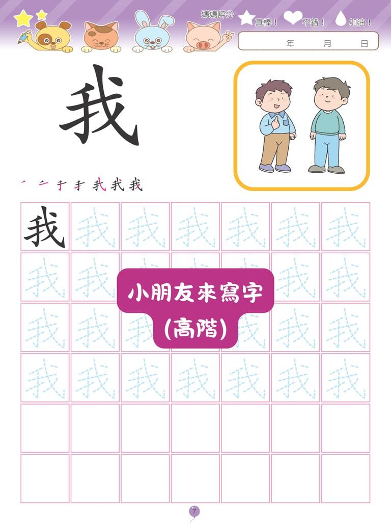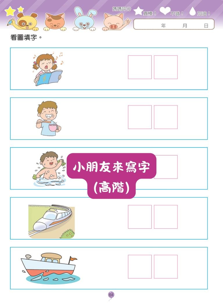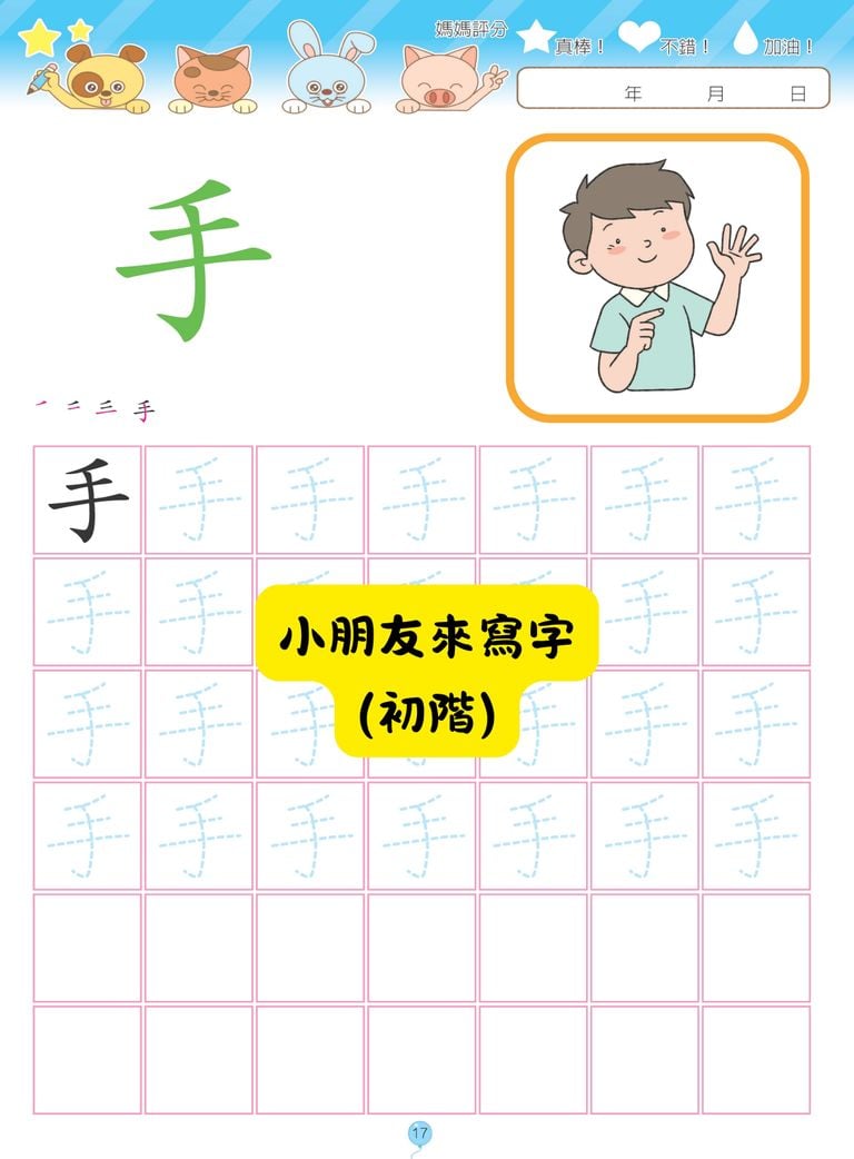 《小朋友來寫字》 (初中高階共3冊) 全彩色,每本64頁 小朋友來寫字-完整寫字訓練套裝!想小朋友掌握正確寫字技巧?建立工整書寫習慣?呢套專業分級設計嘅寫字教材絕對係你嘅中文學習必備寶典! 初階寫字訓練: 基本筆畫練習(橫/豎/撇/捺/點/提/折/鈎) 筆畫組合訓練(十/人/大/小/上/下/中/天) 簡單獨體字(口/日/月/山/水/火/土) 數字漢字(一/二/三/四/五/六/七/八/九/十) 中階寫字訓練: 常用偏旁部首(人部/木部/水部/心部/手部) 合體字結構(左右結構/上下結構/包圍結構) 生活常用字(家/食/沙/妹/海/狗/鳥) 間距控制(字距/行距/版面安排) 高階寫字訓練: 複雜字形練習(筆畫較多/結構複雜字體) 生活常用詞(唱歌/森林/高山/朋友洗澡) 速度提升(流暢書寫/保持工整/提高效率) 美觀要求(字形端正/筆畫清晰/整體美感)