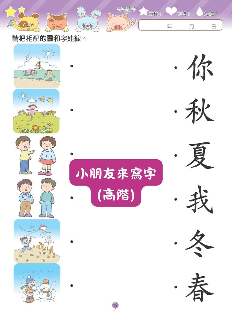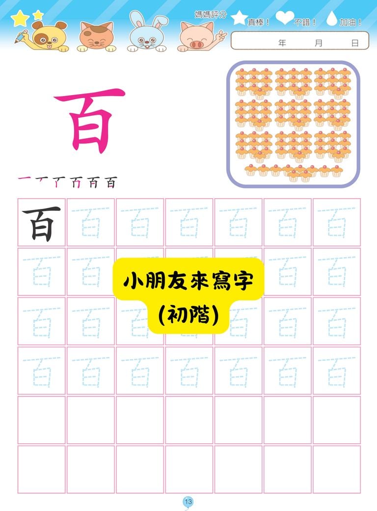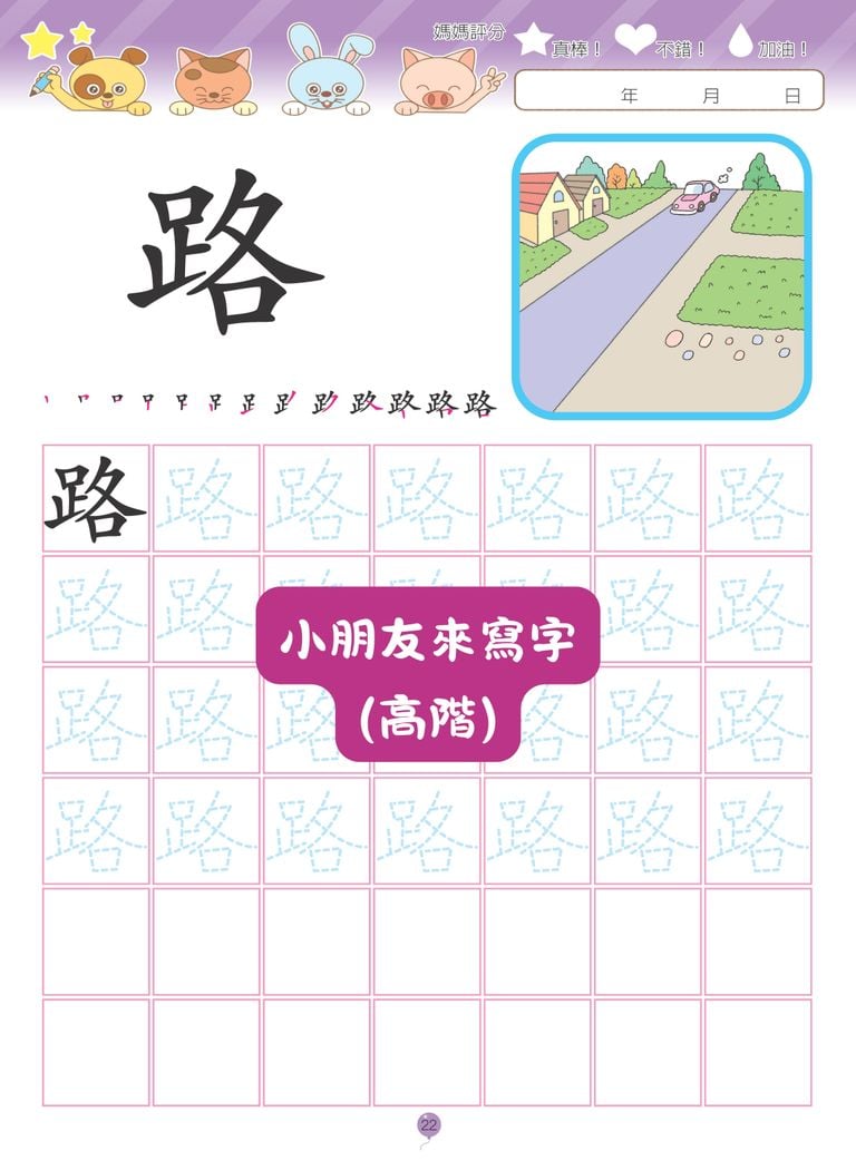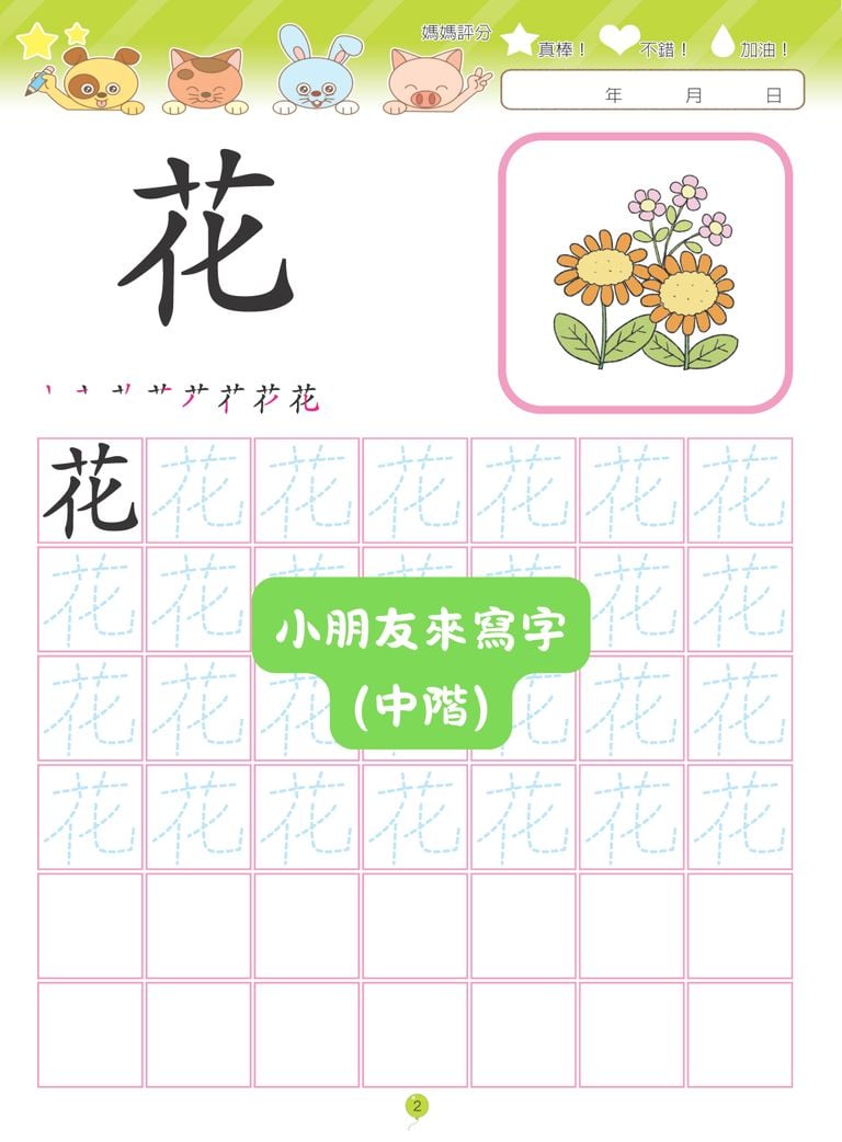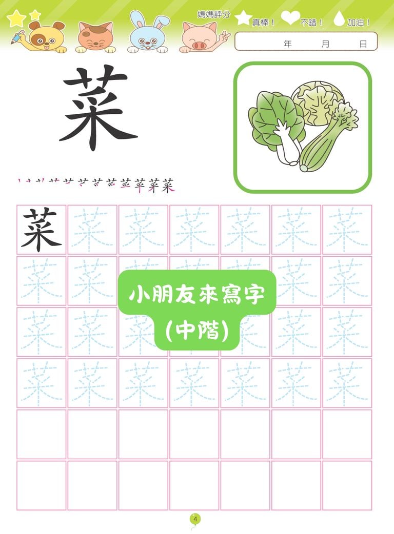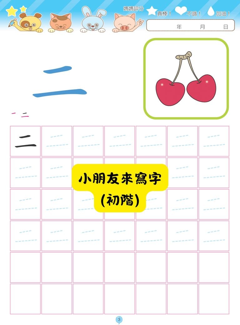 《小朋友來寫字》 (初中高階共3冊) 全彩色,每本64頁 小朋友來寫字-完整寫字訓練套裝!想小朋友掌握正確寫字技巧?建立工整書寫習慣?呢套專業分級設計嘅寫字教材絕對係你嘅中文學習必備寶典! 初階寫字訓練: 基本筆畫練習(橫/豎/撇/捺/點/提/折/鈎) 筆畫組合訓練(十/人/大/小/上/下/中/天) 簡單獨體字(口/日/月/山/水/火/土) 數字漢字(一/二/三/四/五/六/七/八/九/十) 中階寫字訓練: 常用偏旁部首(人部/木部/水部/心部/手部) 合體字結構(左右結構/上下結構/包圍結構) 生活常用字(家/食/沙/妹/海/狗/鳥) 間距控制(字距/行距/版面安排) 高階寫字訓練: 複雜字形練習(筆畫較多/結構複雜字體) 生活常用詞(唱歌/森林/高山/朋友洗澡) 速度提升(流暢書寫/保持工整/提高效率) 美觀要求(字形端正/筆畫清晰/整體美感)