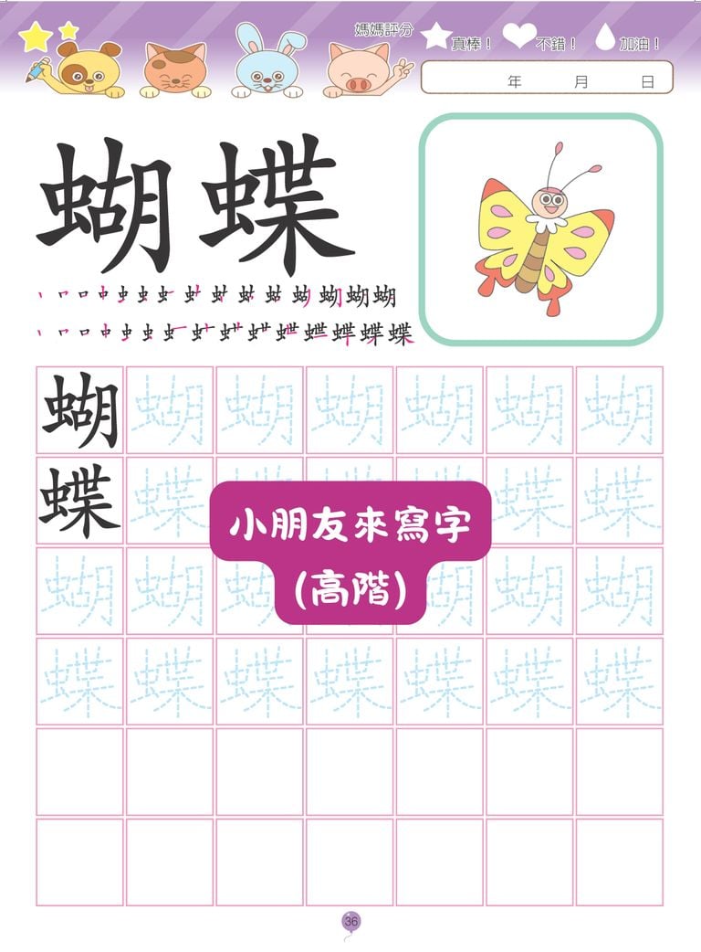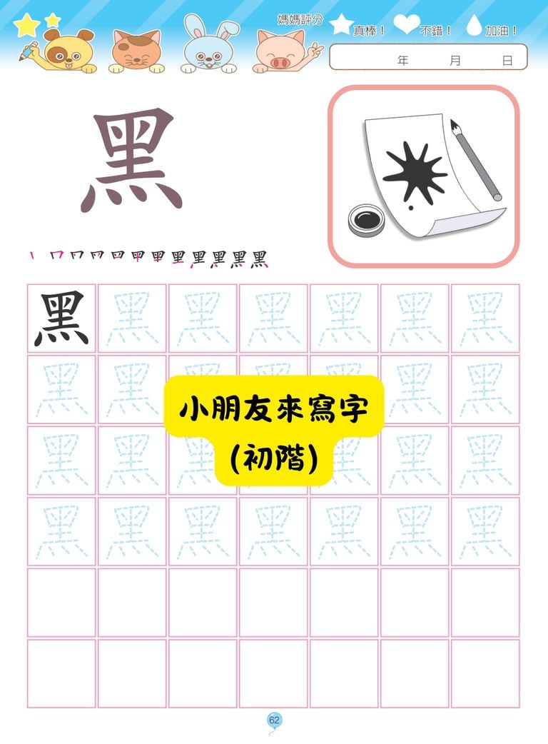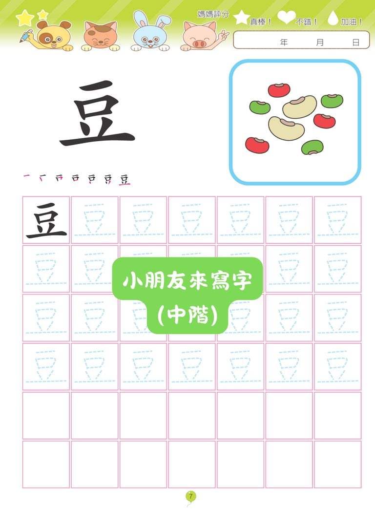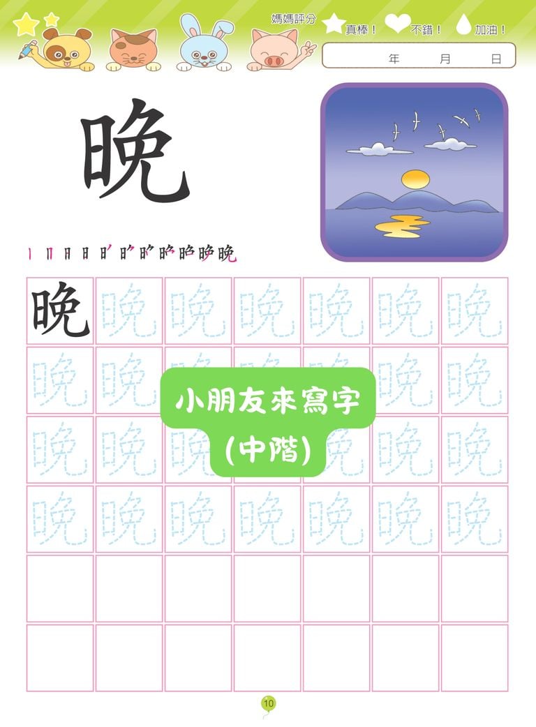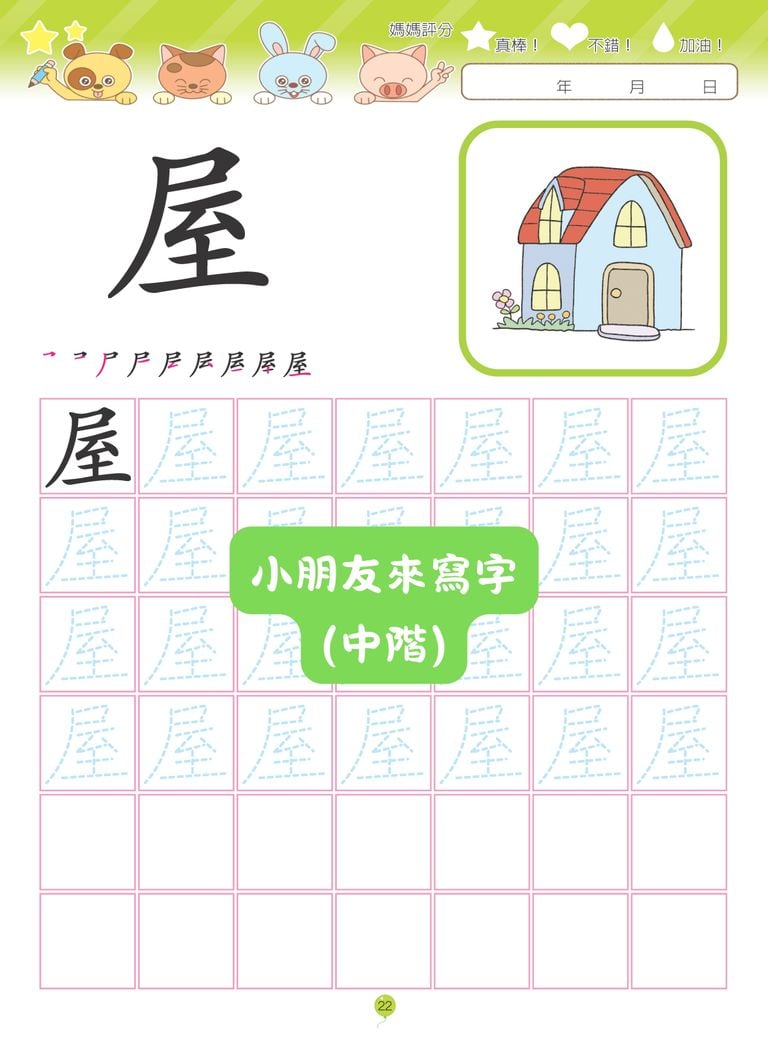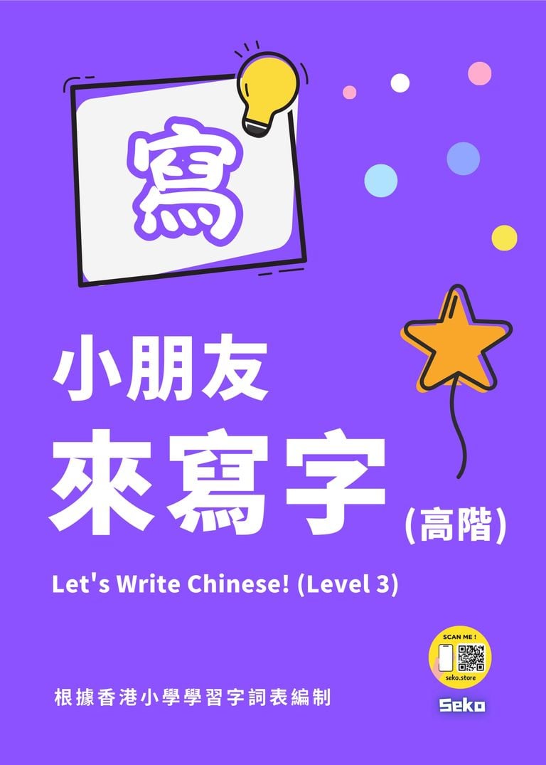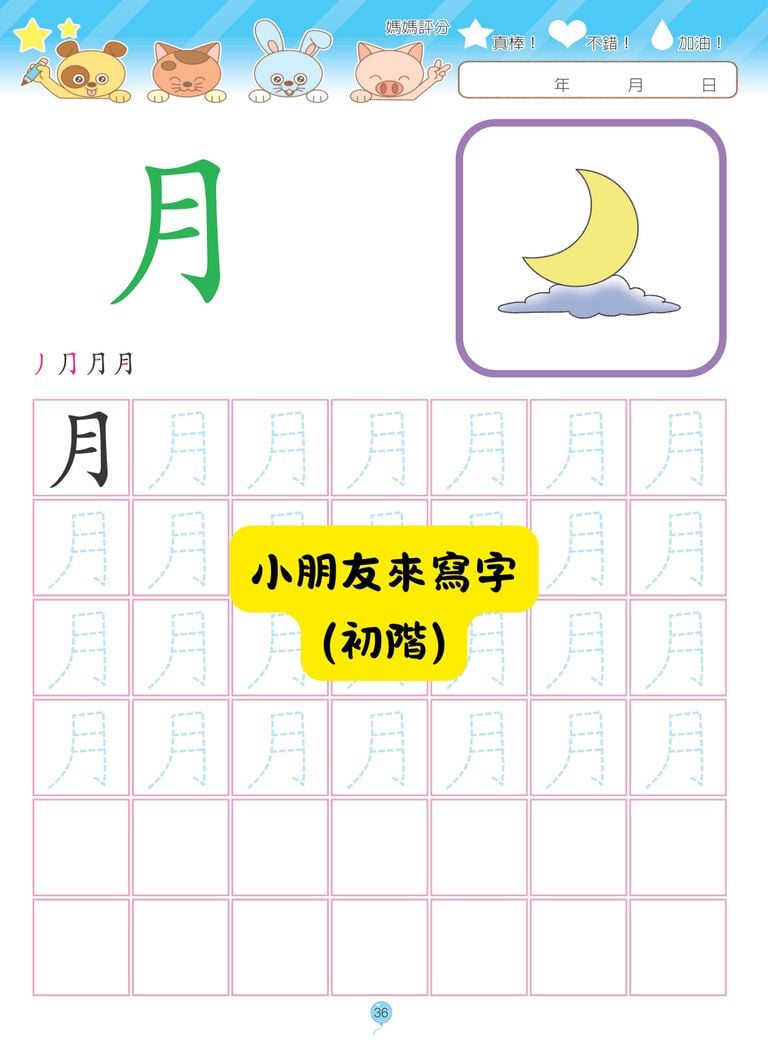 《小朋友來寫字》 (初中高階共3冊) 全彩色,每本64頁 小朋友來寫字-完整寫字訓練套裝!想小朋友掌握正確寫字技巧?建立工整書寫習慣?呢套專業分級設計嘅寫字教材絕對係你嘅中文學習必備寶典! 初階寫字訓練: 基本筆畫練習(橫/豎/撇/捺/點/提/折/鈎) 筆畫組合訓練(十/人/大/小/上/下/中/天) 簡單獨體字(口/日/月/山/水/火/土) 數字漢字(一/二/三/四/五/六/七/八/九/十) 中階寫字訓練: 常用偏旁部首(人部/木部/水部/心部/手部) 合體字結構(左右結構/上下結構/包圍結構) 生活常用字(家/食/沙/妹/海/狗/鳥) 間距控制(字距/行距/版面安排) 高階寫字訓練: 複雜字形練習(筆畫較多/結構複雜字體) 生活常用詞(唱歌/森林/高山/朋友洗澡) 速度提升(流暢書寫/保持工整/提高效率) 美觀要求(字形端正/筆畫清晰/整體美感)