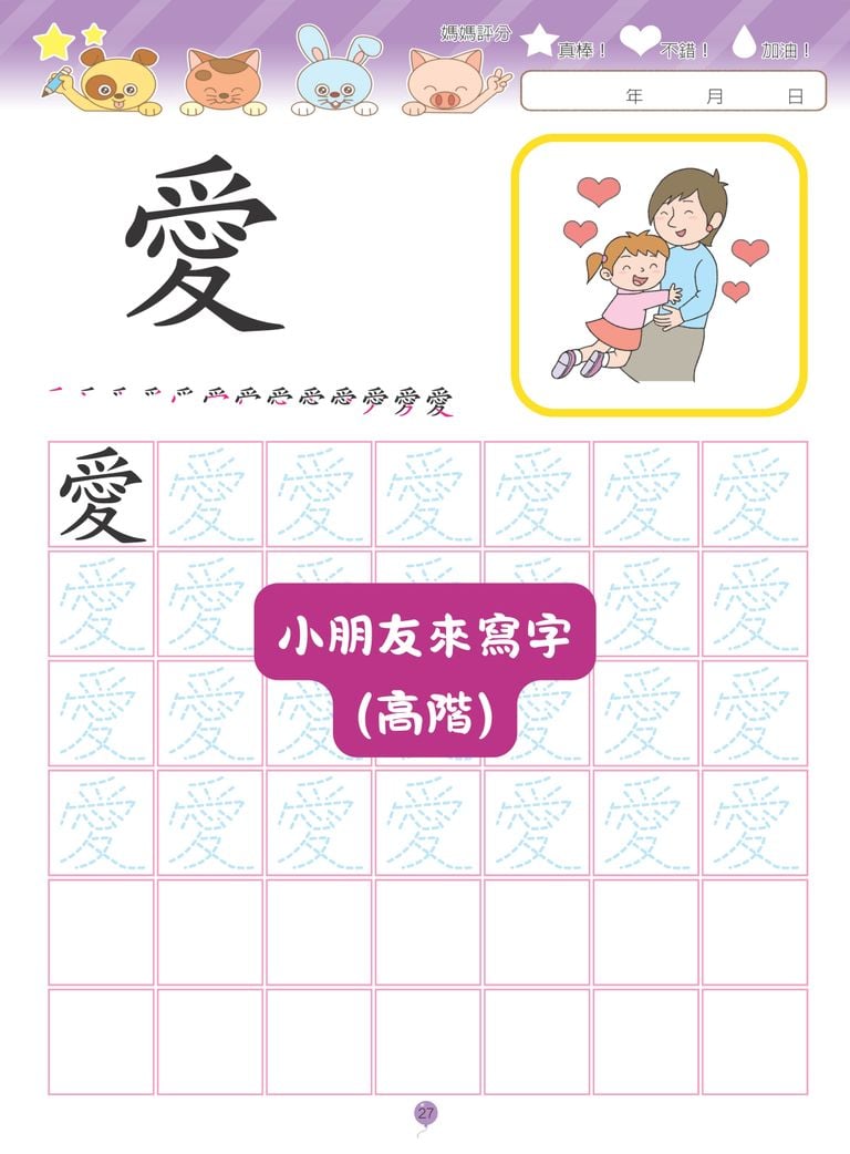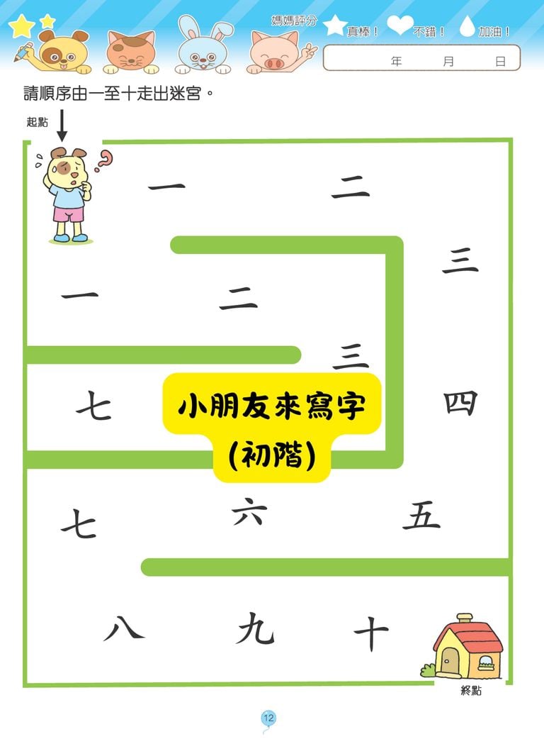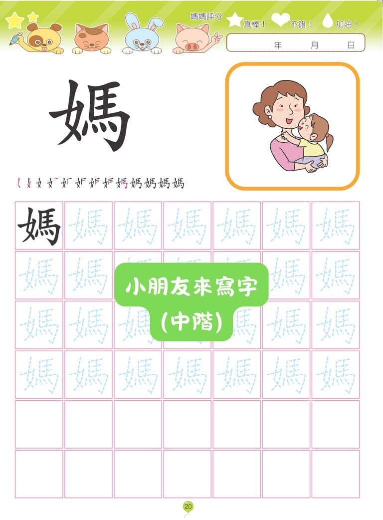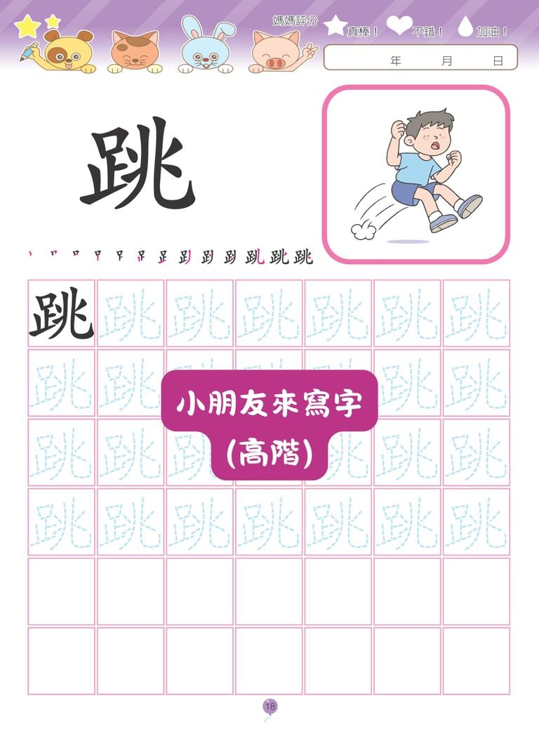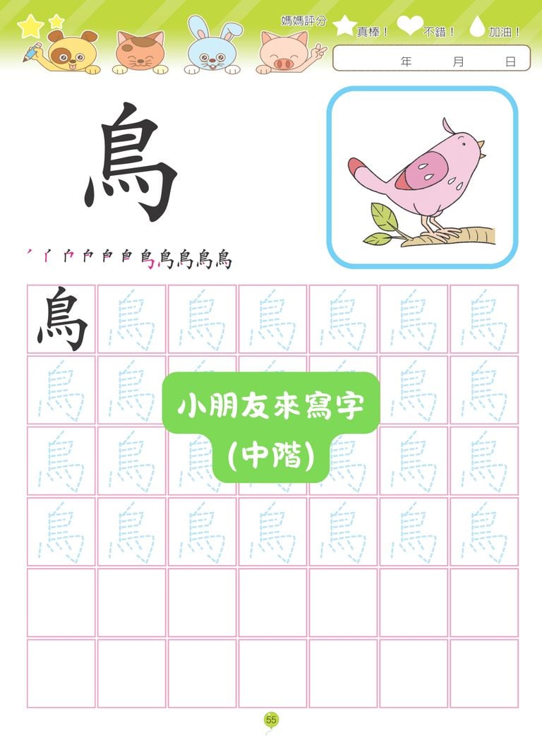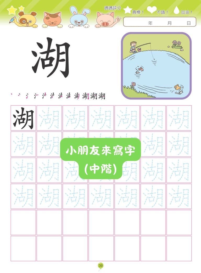 《小朋友來寫字》 (初中高階共3冊) 全彩色,每本64頁 小朋友來寫字-完整寫字訓練套裝!想小朋友掌握正確寫字技巧?建立工整書寫習慣?呢套專業分級設計嘅寫字教材絕對係你嘅中文學習必備寶典! 初階寫字訓練: 基本筆畫練習(橫/豎/撇/捺/點/提/折/鈎) 筆畫組合訓練(十/人/大/小/上/下/中/天) 簡單獨體字(口/日/月/山/水/火/土) 數字漢字(一/二/三/四/五/六/七/八/九/十) 中階寫字訓練: 常用偏旁部首(人部/木部/水部/心部/手部) 合體字結構(左右結構/上下結構/包圍結構) 生活常用字(家/食/沙/妹/海/狗/鳥) 間距控制(字距/行距/版面安排) 高階寫字訓練: 複雜字形練習(筆畫較多/結構複雜字體) 生活常用詞(唱歌/森林/高山/朋友洗澡) 速度提升(流暢書寫/保持工整/提高效率) 美觀要求(字形端正/筆畫清晰/整體美感)