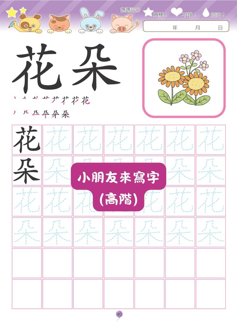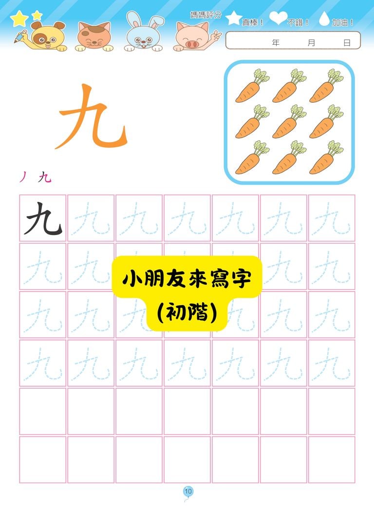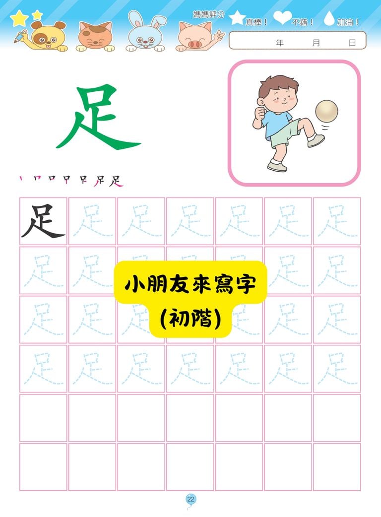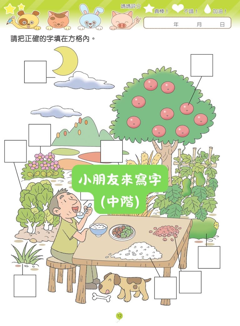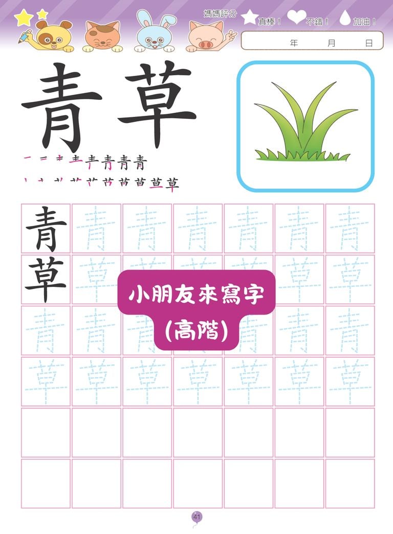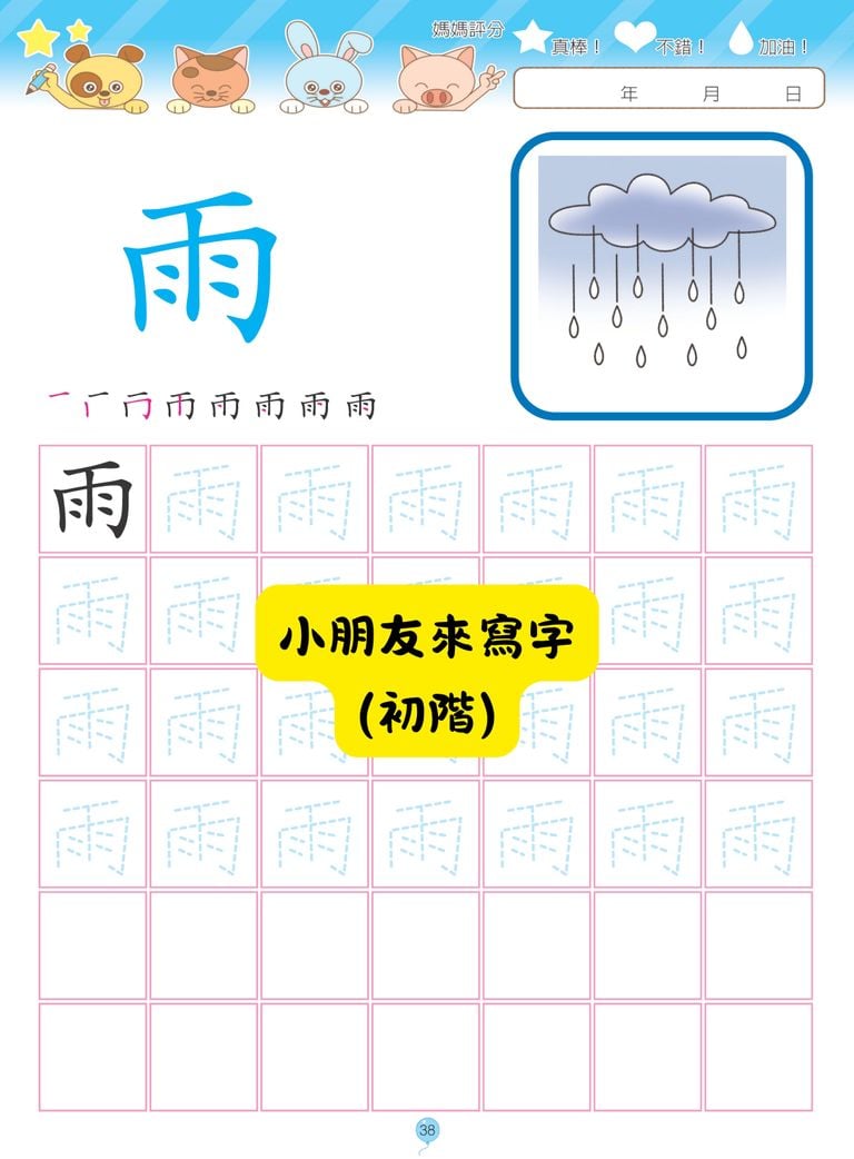 《小朋友來寫字》 (初中高階共3冊) 全彩色,每本64頁 小朋友來寫字-完整寫字訓練套裝!想小朋友掌握正確寫字技巧?建立工整書寫習慣?呢套專業分級設計嘅寫字教材絕對係你嘅中文學習必備寶典! 初階寫字訓練: 基本筆畫練習(橫/豎/撇/捺/點/提/折/鈎) 筆畫組合訓練(十/人/大/小/上/下/中/天) 簡單獨體字(口/日/月/山/水/火/土) 數字漢字(一/二/三/四/五/六/七/八/九/十) 中階寫字訓練: 常用偏旁部首(人部/木部/水部/心部/手部) 合體字結構(左右結構/上下結構/包圍結構) 生活常用字(家/食/沙/妹/海/狗/鳥) 間距控制(字距/行距/版面安排) 高階寫字訓練: 複雜字形練習(筆畫較多/結構複雜字體) 生活常用詞(唱歌/森林/高山/朋友洗澡) 速度提升(流暢書寫/保持工整/提高效率) 美觀要求(字形端正/筆畫清晰/整體美感)