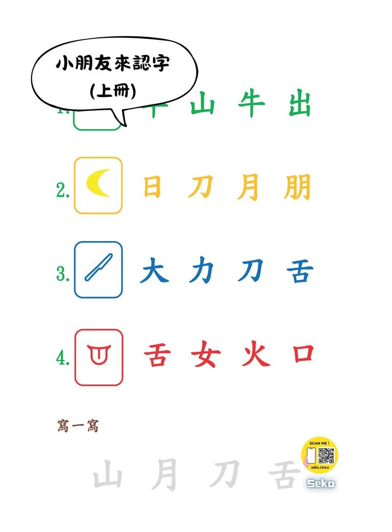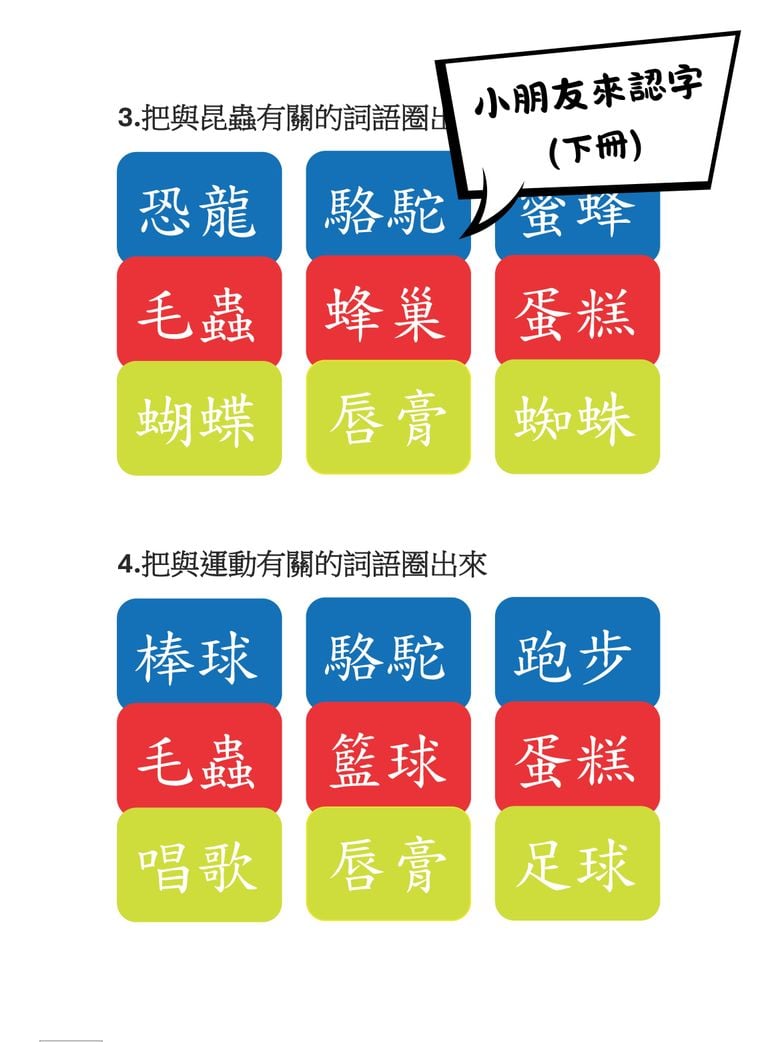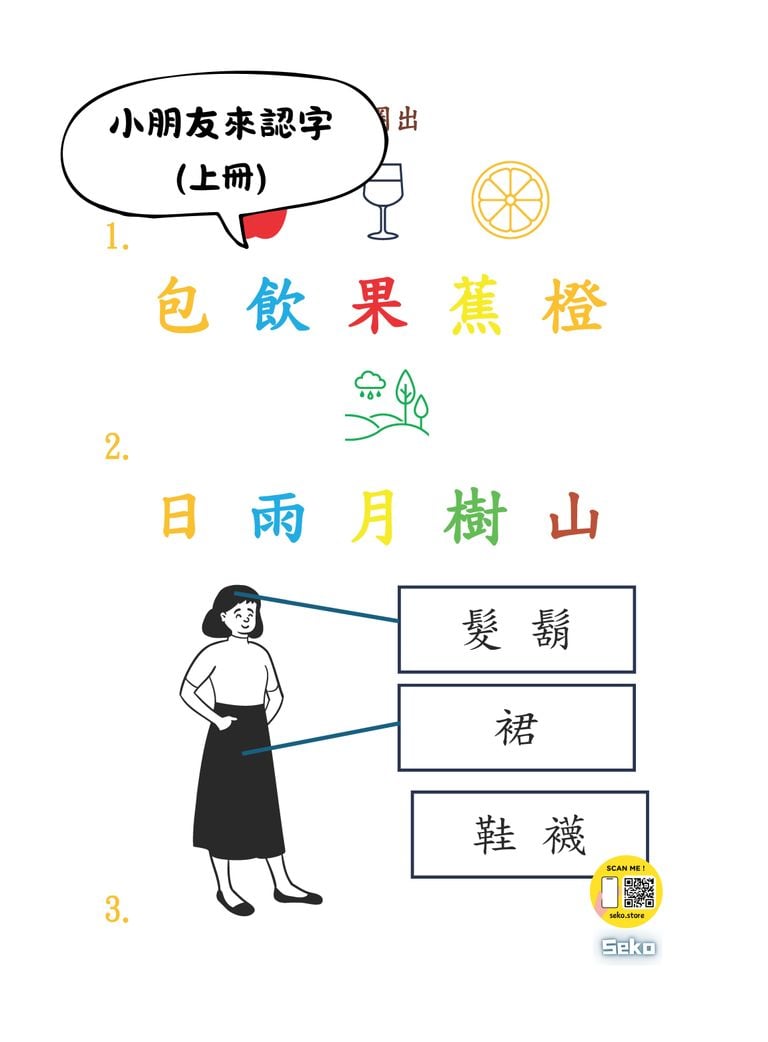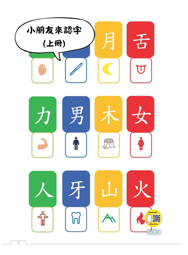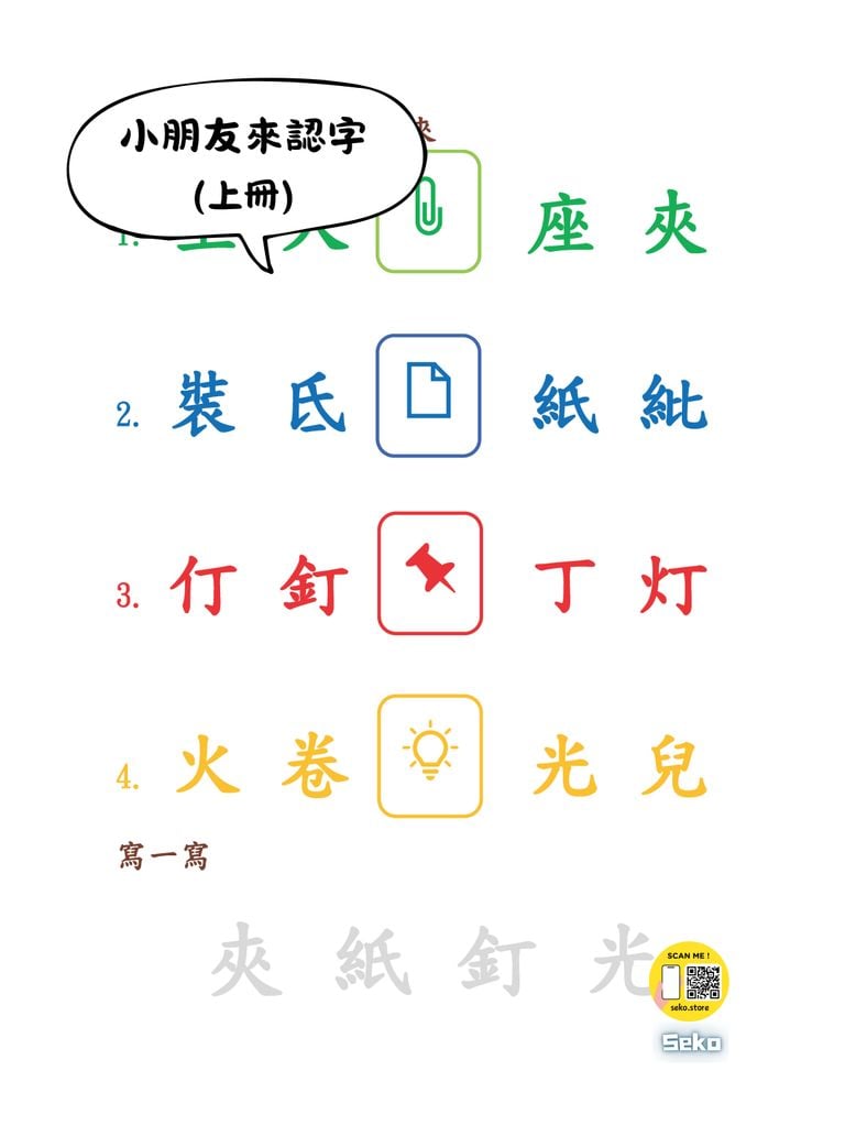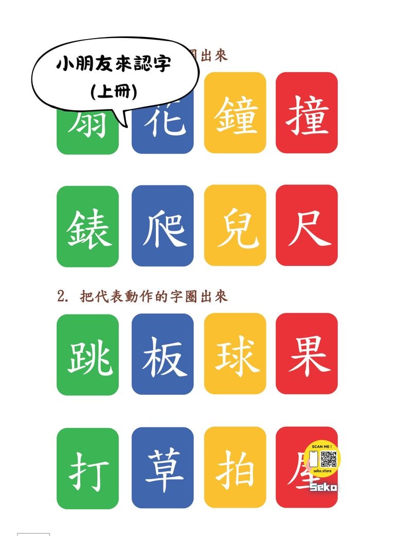 1. 《小朋友來認字》 (上下兩冊) 全部根據香港小學學習字詞表編制。全書66 頁, 全彩色, 香港印刷,附答案。 上冊超過300個單字, 下冊超過300個詞語。涵蓋初小常用字! 全方位識字訓練套裝! 1️⃣ 小朋友認字套裝特色 🔍 專業學習設計: 年齡分級訓練(2-3歲/4-5歲/6-7歲適齡編排) 趣味互動教學(遊戲化學習/親子活動) 循序漸進編排(由簡到繁/由具體到抽象) 多感官學習法(視覺/聽覺/觸覺並用) 生活化詞彙(日常用字/實用性強) 2️⃣ 階段性認字重點 📊 分齡學習目標: Step 1 啟蒙階段(2-3歲): 基礎漢字(爸/媽/我/你/大/小) 象形字認識(日/月/山/水/火/木) 數字識別(一/二/三/四/五) 顏色概念(紅/黃/藍/綠/白/黑) Step 2 發展階段(4-5歲): 常用字詞(學校/朋友/老師/同學) 動作詞彙(跑/跳/笑/哭/吃/睡) 形容詞運用(高/矮/胖/瘦/美/醜) 簡單句子(我愛媽媽/今天很熱) Step 3 鞏固階段(6-7歲): 學前必備(涵蓋小一常用字) 詞語配對(反義詞/同義詞) 短文閱讀(兩至三句完整故事) 基礎寫字(筆順/結構/字型) 識字竅門: 先易後難(由簡單字開始學習) 先具體後抽象(實物→圖片→文字) 先單字後詞語(掌握單字再組合) 先認讀後書寫(理解優先/避免機械抄寫)