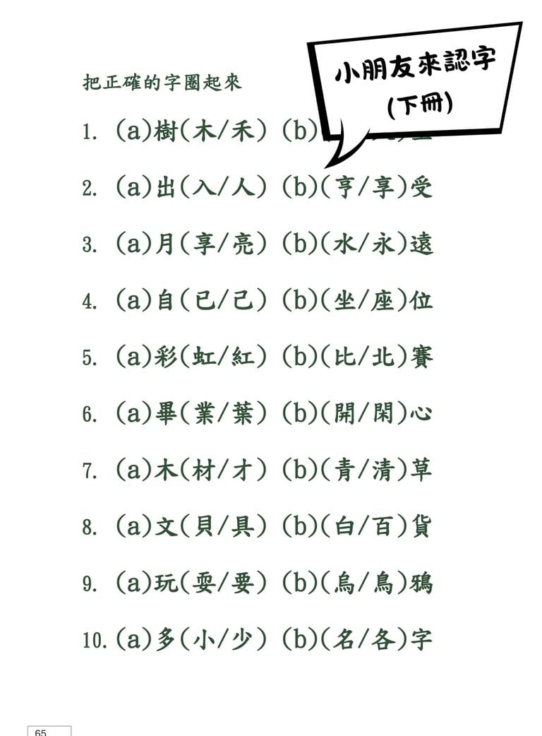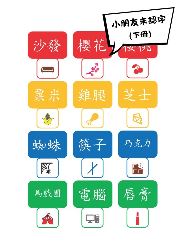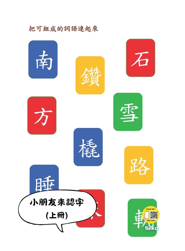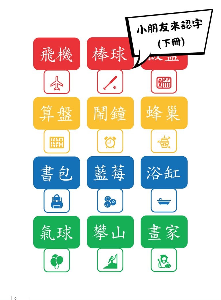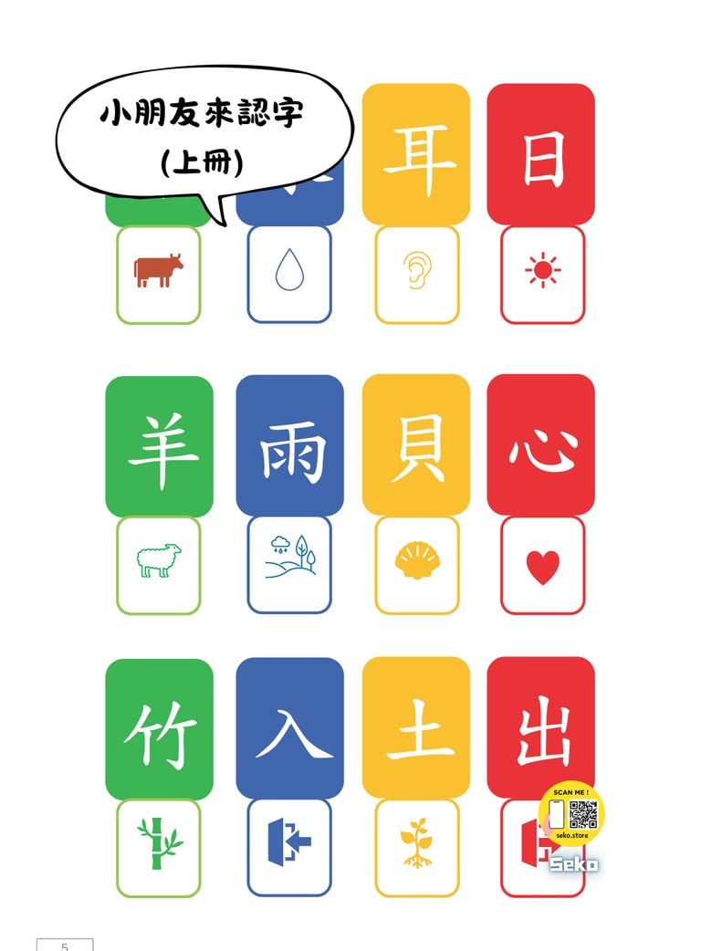 1. 《小朋友來認字》 (上下兩冊) 全部根據香港小學學習字詞表編制。全書66 頁, 全彩色, 香港印刷,附答案。 上冊超過300個單字, 下冊超過300個詞語。涵蓋初小常用字! 全方位識字訓練套裝! 1️⃣ 小朋友認字套裝特色 🔍 專業學習設計: 年齡分級訓練(2-3歲/4-5歲/6-7歲適齡編排) 趣味互動教學(遊戲化學習/親子活動) 循序漸進編排(由簡到繁/由具體到抽象) 多感官學習法(視覺/聽覺/觸覺並用) 生活化詞彙(日常用字/實用性強) 2️⃣ 階段性認字重點 📊 分齡學習目標: Step 1 啟蒙階段(2-3歲): 基礎漢字(爸/媽/我/你/大/小) 象形字認識(日/月/山/水/火/木) 數字識別(一/二/三/四/五) 顏色概念(紅/黃/藍/綠/白/黑) Step 2 發展階段(4-5歲): 常用字詞(學校/朋友/老師/同學) 動作詞彙(跑/跳/笑/哭/吃/睡) 形容詞運用(高/矮/胖/瘦/美/醜) 簡單句子(我愛媽媽/今天很熱) Step 3 鞏固階段(6-7歲): 學前必備(涵蓋小一常用字) 詞語配對(反義詞/同義詞) 短文閱讀(兩至三句完整故事) 基礎寫字(筆順/結構/字型) 識字竅門: 先易後難(由簡單字開始學習) 先具體後抽象(實物→圖片→文字) 先單字後詞語(掌握單字再組合) 先認讀後書寫(理解優先/避免機械抄寫)