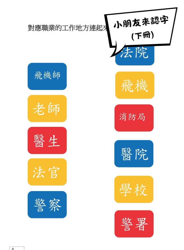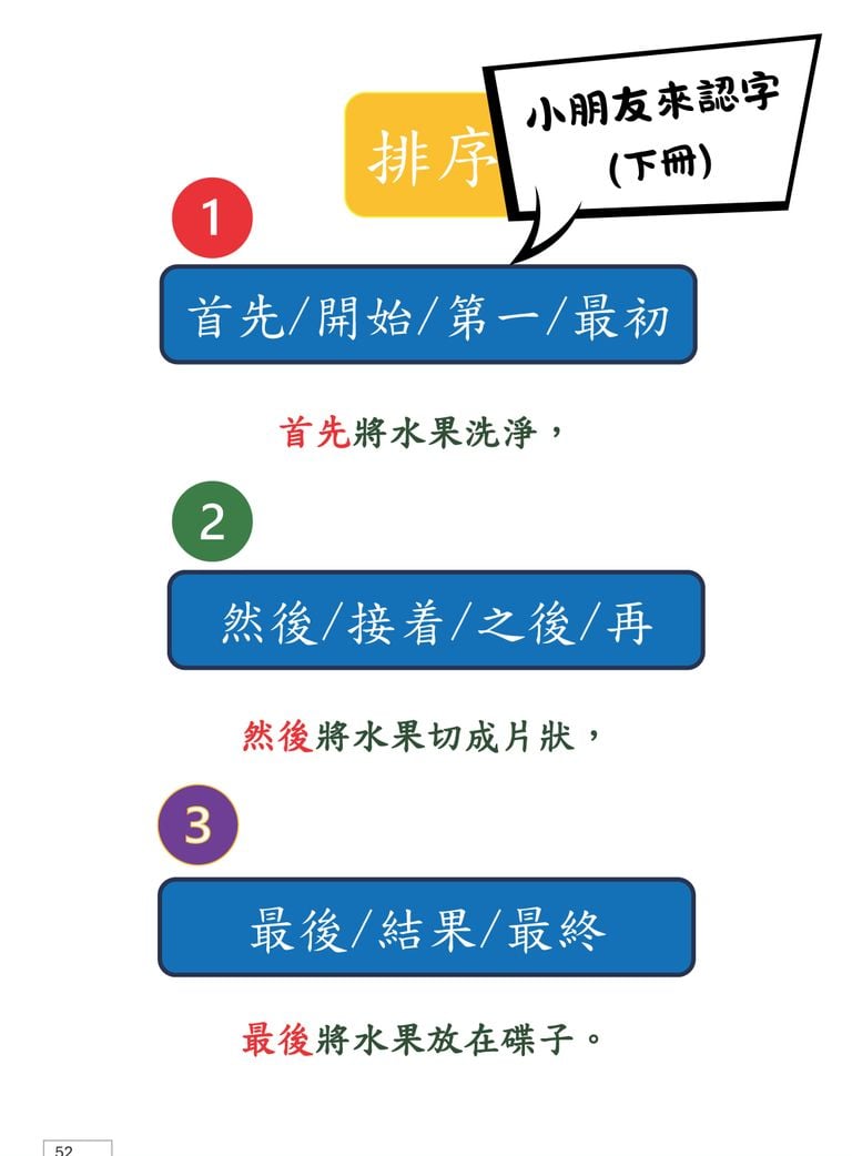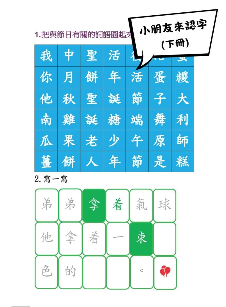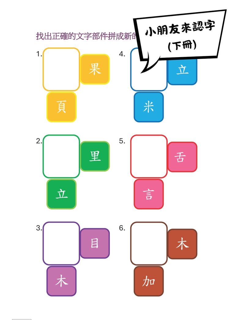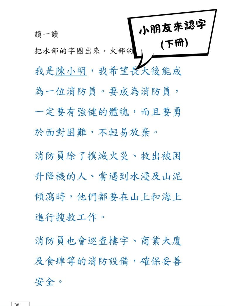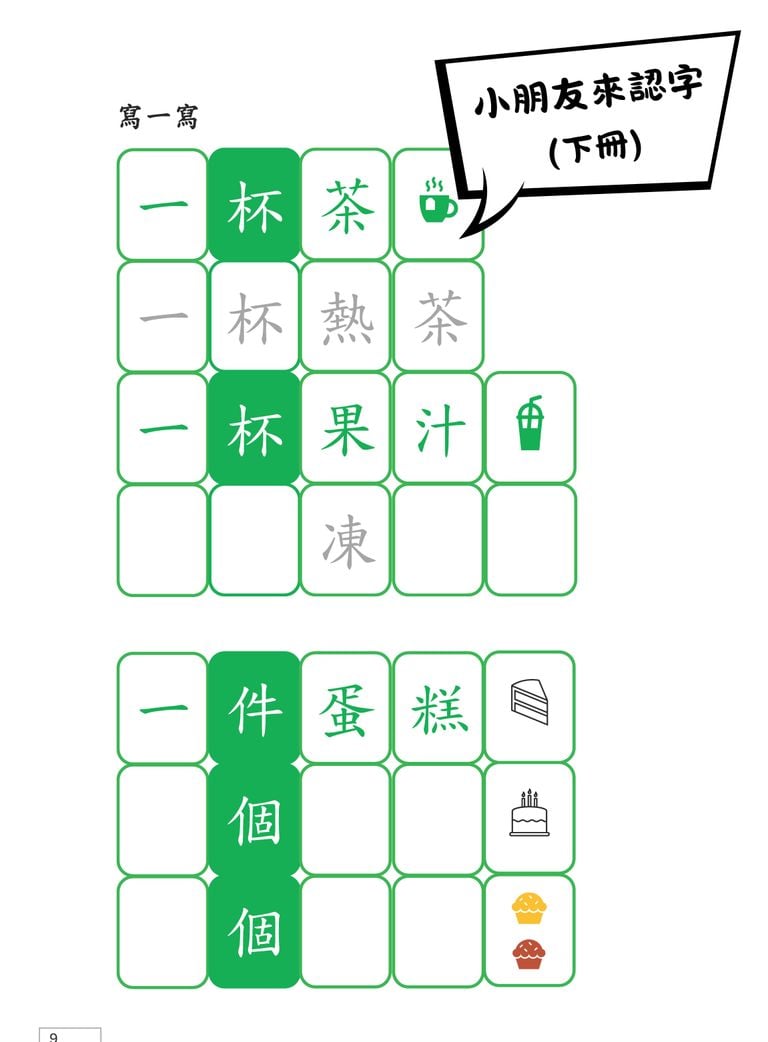 1. 《小朋友來認字》 (上下兩冊) 全部根據香港小學學習字詞表編制。全書66 頁, 全彩色, 香港印刷,附答案。 上冊超過300個單字, 下冊超過300個詞語。涵蓋初小常用字! 全方位識字訓練套裝! 1️⃣ 小朋友認字套裝特色 🔍 專業學習設計: 年齡分級訓練(2-3歲/4-5歲/6-7歲適齡編排) 趣味互動教學(遊戲化學習/親子活動) 循序漸進編排(由簡到繁/由具體到抽象) 多感官學習法(視覺/聽覺/觸覺並用) 生活化詞彙(日常用字/實用性強) 2️⃣ 階段性認字重點 📊 分齡學習目標: Step 1 啟蒙階段(2-3歲): 基礎漢字(爸/媽/我/你/大/小) 象形字認識(日/月/山/水/火/木) 數字識別(一/二/三/四/五) 顏色概念(紅/黃/藍/綠/白/黑) Step 2 發展階段(4-5歲): 常用字詞(學校/朋友/老師/同學) 動作詞彙(跑/跳/笑/哭/吃/睡) 形容詞運用(高/矮/胖/瘦/美/醜) 簡單句子(我愛媽媽/今天很熱) Step 3 鞏固階段(6-7歲): 學前必備(涵蓋小一常用字) 詞語配對(反義詞/同義詞) 短文閱讀(兩至三句完整故事) 基礎寫字(筆順/結構/字型) 識字竅門: 先易後難(由簡單字開始學習) 先具體後抽象(實物→圖片→文字) 先單字後詞語(掌握單字再組合) 先認讀後書寫(理解優先/避免機械抄寫)